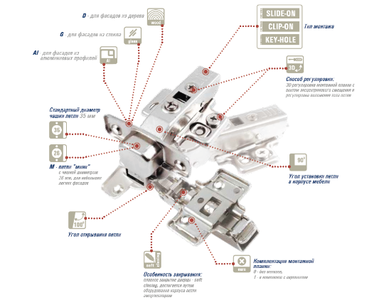 SOFT CLOSING – петли, в конструкции которых присутствуетамортизационное устройство, позволяющее обеспечить плавноезакрывание створки дверцы.